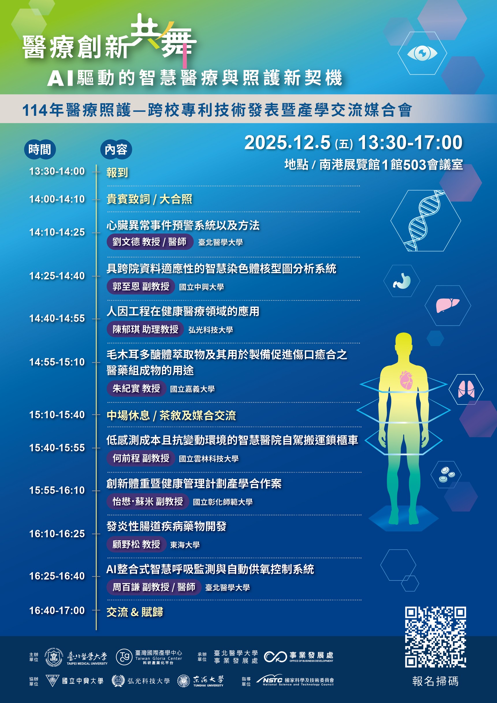 誠摯邀請一同參與「科研平台主題式跨校媒合會—114/12/05 跨校專利技術交流暨產學媒合交流會:創新醫療照護大未來」。
